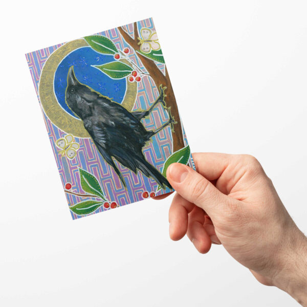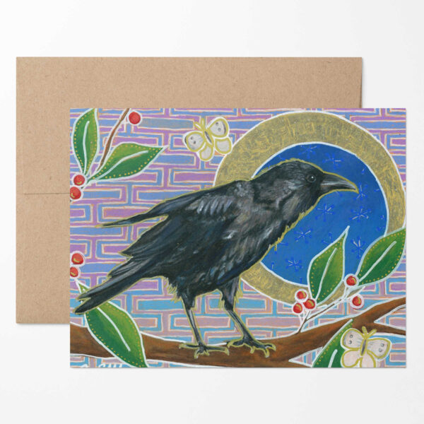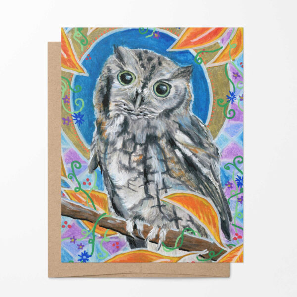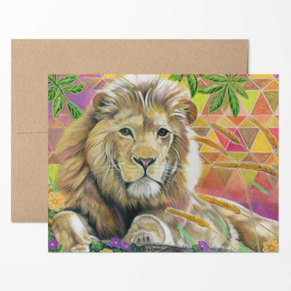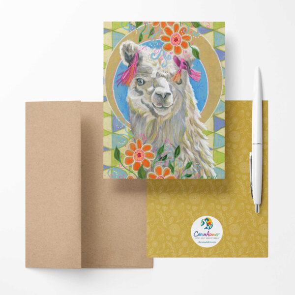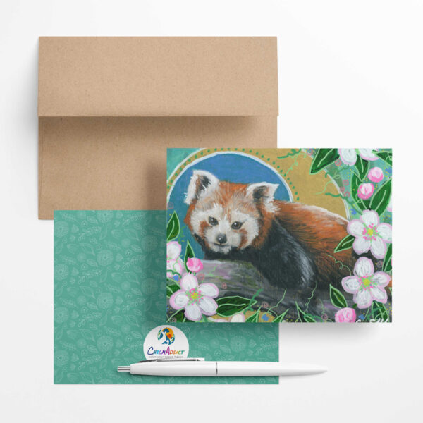 Set of 6 art cards and envelopes featuring animals in an art nouveau style. The original art featured on each card was created by artist Carrie Alderfer. Animals in this set include a lion, cheetahs, owl, red panda, llama, and a raven. Each card has a coordinating pattern on the back. Size of card is 4.25″ x 5.5″ (A2). The inside is blank with no coating so you can easily write whatever sentiment you want. These come packaged in a clear box making them the perfect gift.
