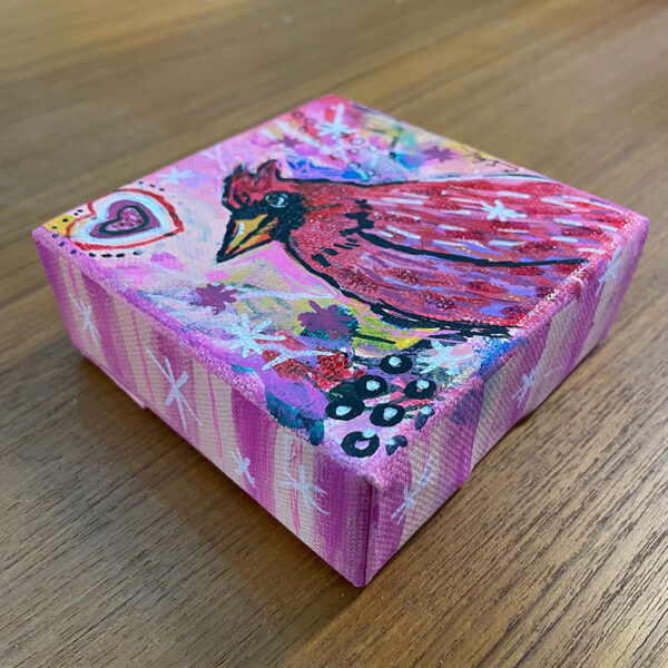 “Cardinal #5″ is an original acrylic piece created by Carrie Alderfer. It measures 4″ x 4″ and is 1.5″ deep. You can customize the piece with a name or word on each side of the piece.
