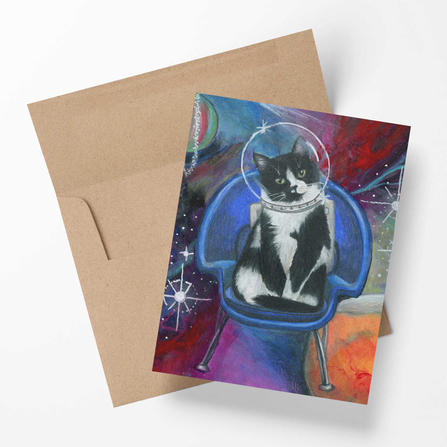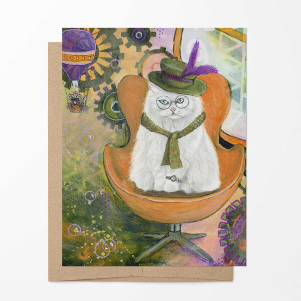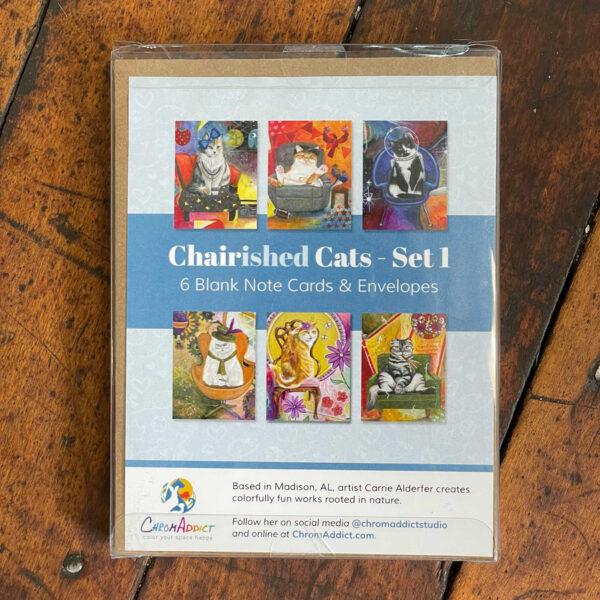 Set of 6 blank note cards and envelopes featuring cats from the Chairished Cats series drawn by artist Carrie Alderfer. Cats included are steampunk, art nouveau, pop princess, armchair quarterback, party, and space. Card has a coordinating pattern on the back. Size of card is 4.25″ x 5.5″ (A2). These come packaged in a clear box making them the perfect gift.