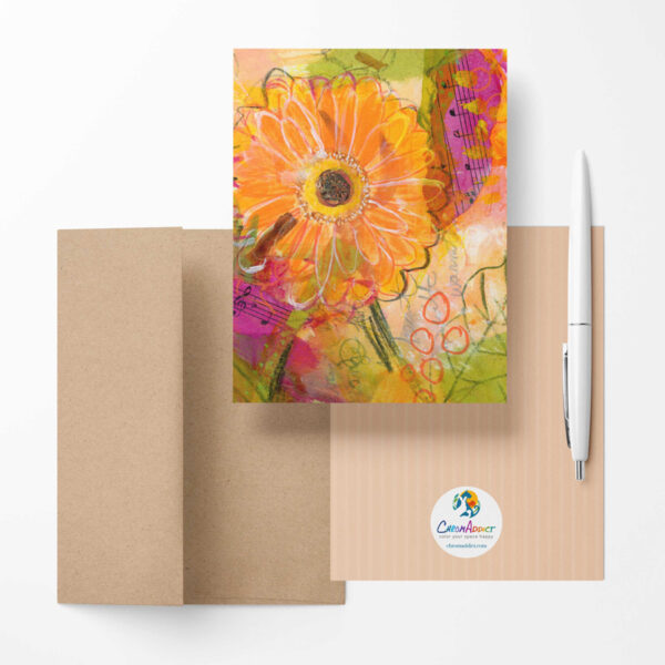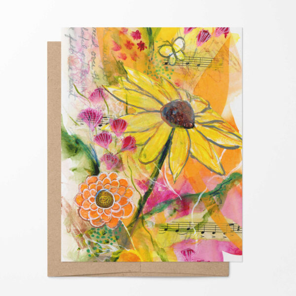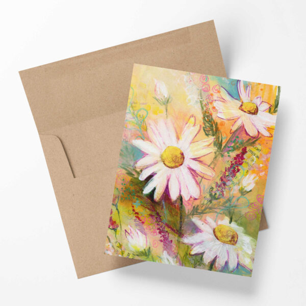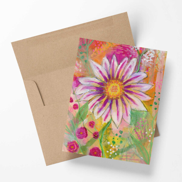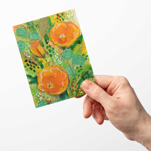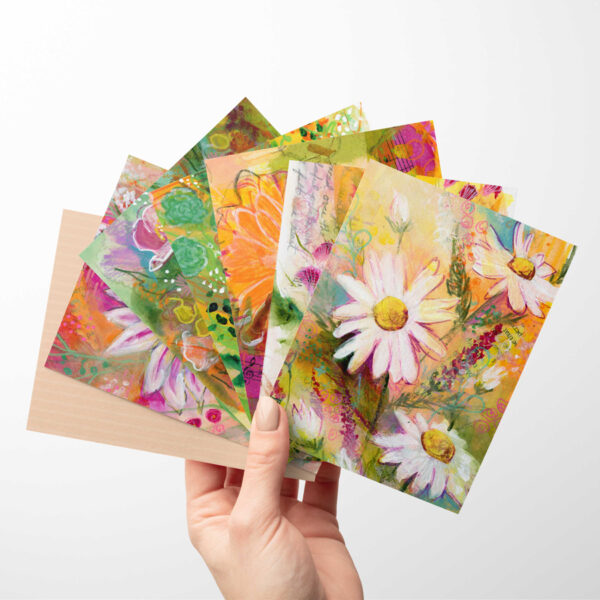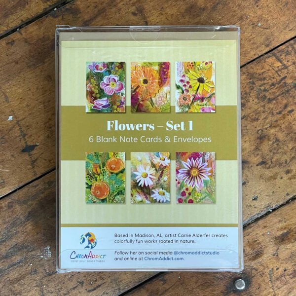 Set of 6 art cards and envelopes featuring flowers. The original art featured on each card was created by artist Carrie Alderfer. Each card has a coordinating pattern on the back. Size of card is 4.25″ x 5.5″ (A2). The inside is blank with no coating so you can easily write whatever sentiment you want. These come packaged in a clear box making them the perfect gift.