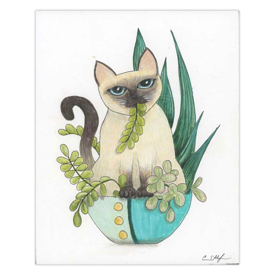 “Snack Time” is an original colored pencil piece created by Carrie Alderfer. It’s part of the 2022 Planted Cats calendar. It features a siamese cat munching on a fern.