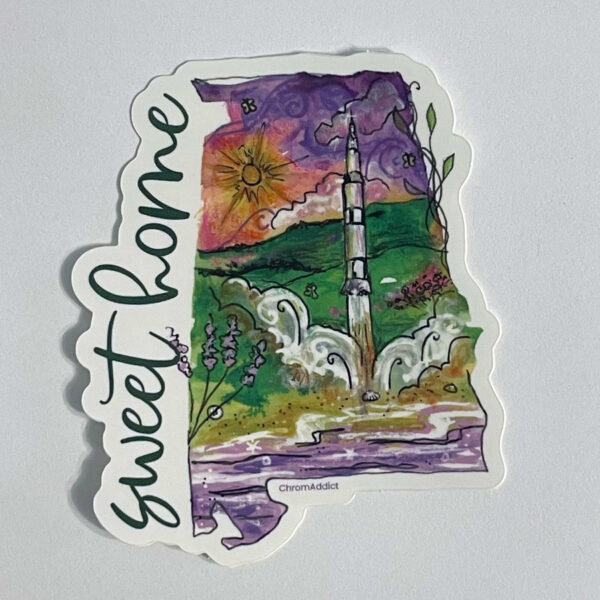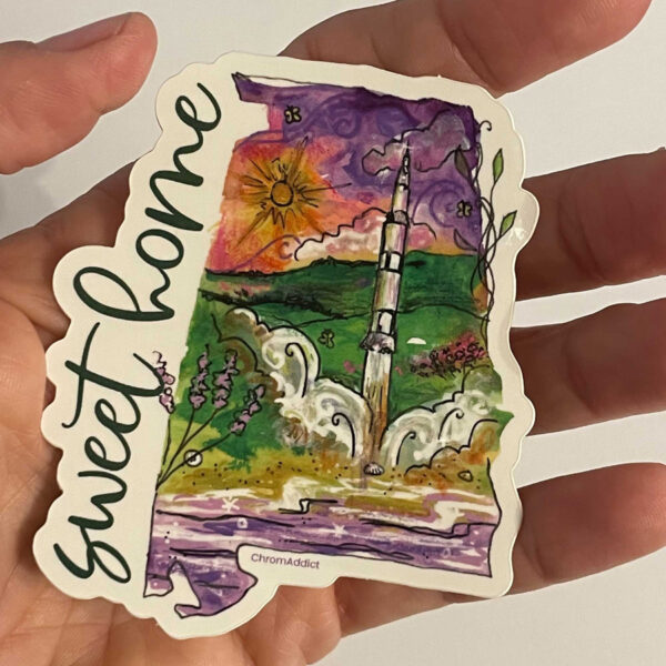 Huntsville, Alabama, is home to Marshall Space Flight Center and has had an important role in NASA. Here’s to past, present, and future moon missions…and beyond! This die cut sticker is approximately 3″ tall x 2.75″ wide.